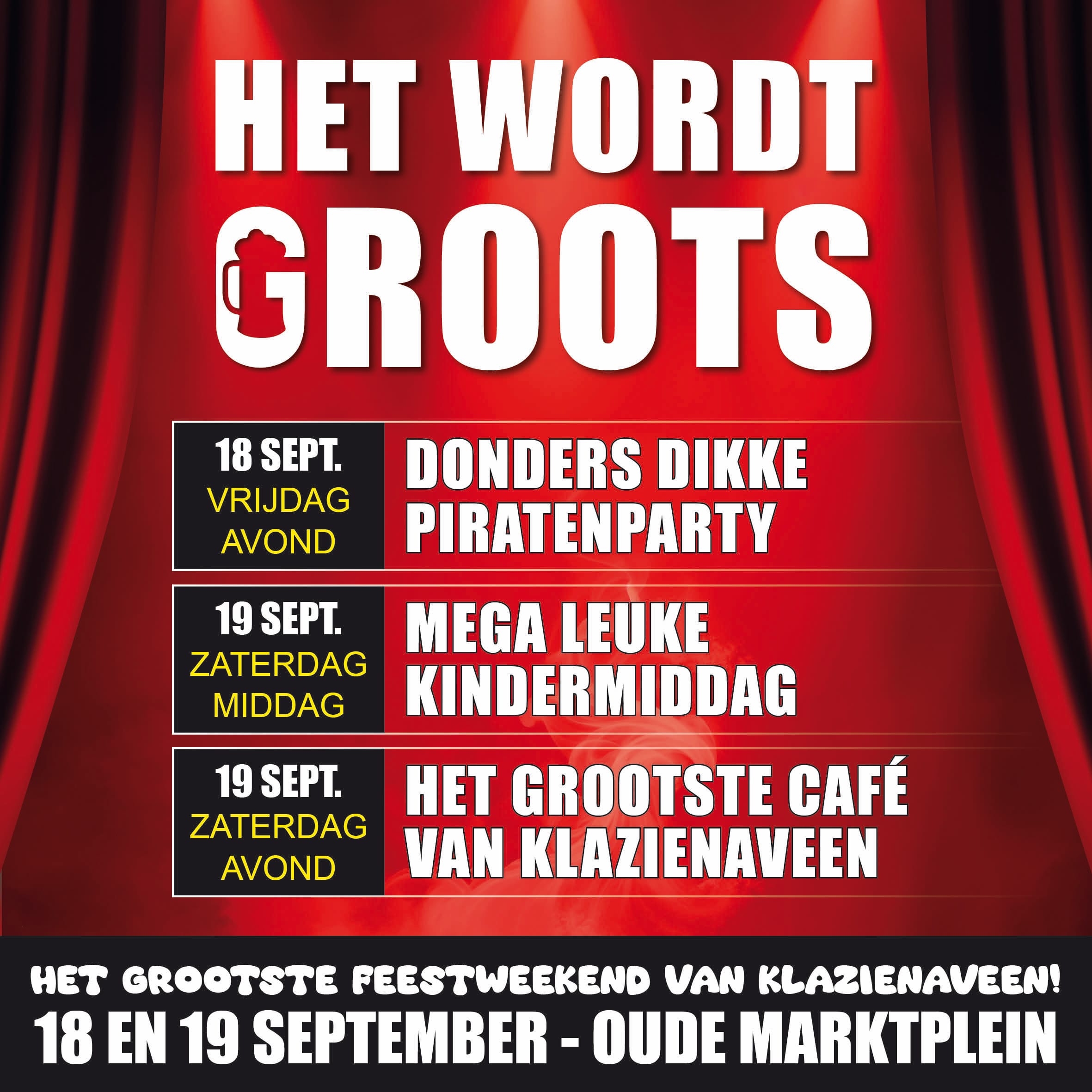 Op vrijdag 18 en zaterdag 19 september verandert het oude marktplein in Klazienaveen opnieuw in een bruisend feestterrein. Twee dagen lang geniet je van muziek, gezelligheid en spektakel voor jong én oud.
